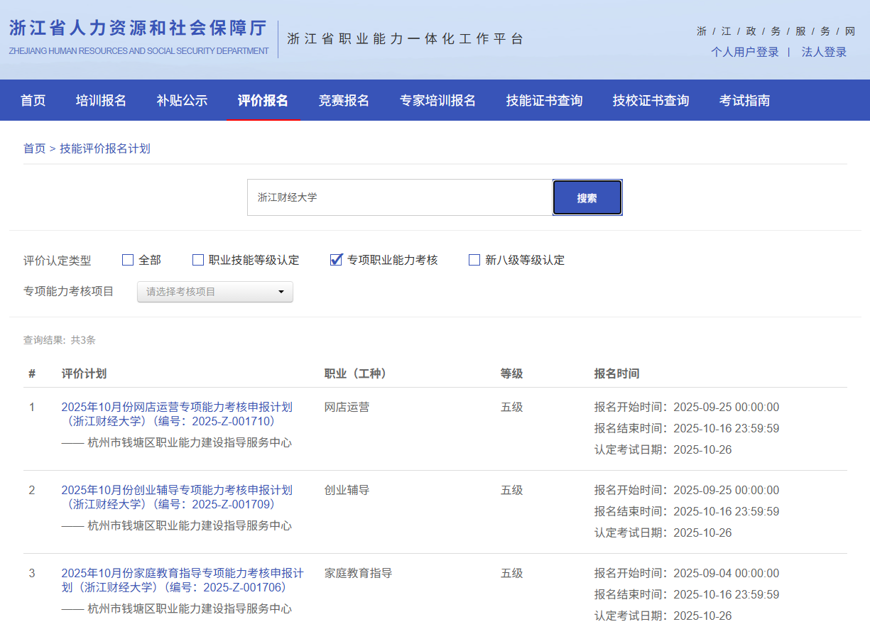 (一)进入评价报名界面后,评价认定类型勾选“专项职业能力考核”,在搜索框内输入【浙江财经大学】