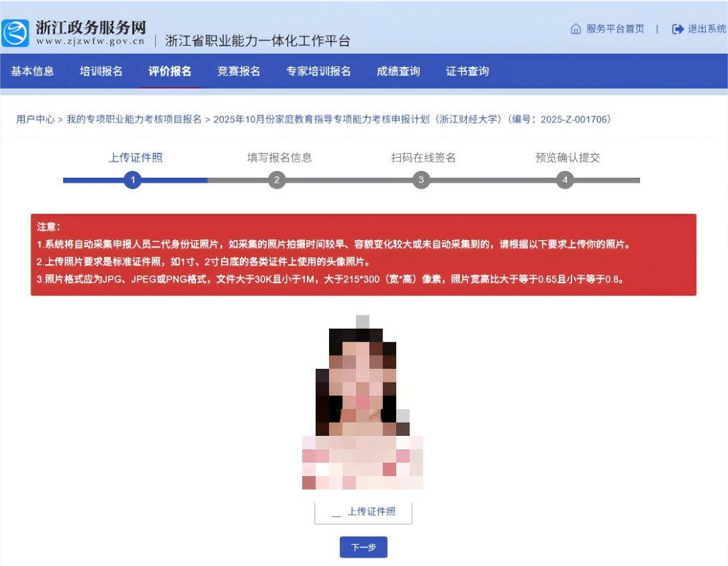 注:系统会自动采集申报人员的二代身份证照片;如果没有自动采集成功,请考生上传本人证件照,证件照需要满足界面红色区域中的第2和第3点要求。