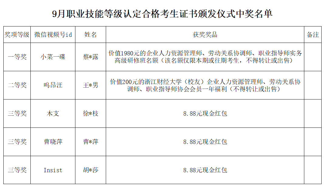 根据浙江财经大学管理学院职业技能等级认定中心关于《定期举办职业技能等级认定合格考生证书颁发仪式(直播)幸运抽奖》的通知,经公开抽取并核对确认,现将“9月职业技能等级认定合格考生证书颁发仪式”活动中奖名单公示如下: