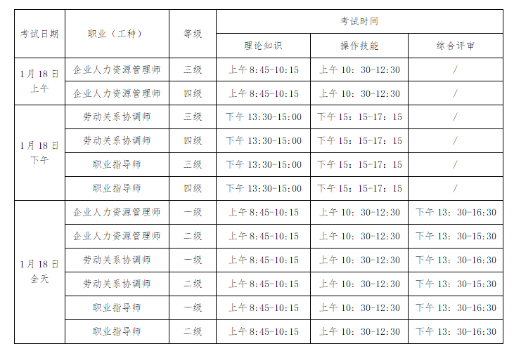 考试时间为2026年1月18日(周日),请考生根据申报的职业(等级)参加考试,具体安排如下:
