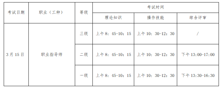 考试时间为2026年3月15日(周日),请考生根据申报的职业(等级)参加考试,具体安排如下: