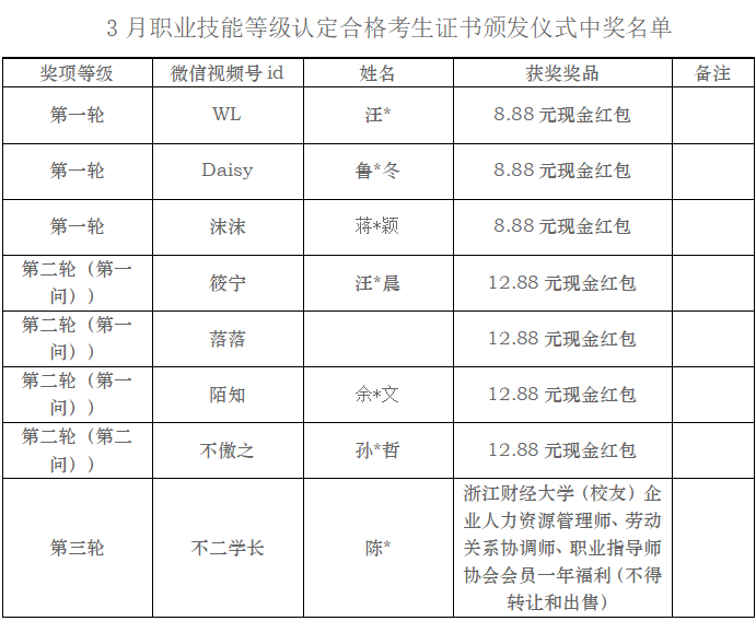 根据浙江财经大学管理学院职业技能等级认定中心关于《定期举办职业技能等级认定合格考生证书颁发仪式(直播)幸运抽奖》的通知,经公开抽取并核对确认,现将“3月职业技能等级认定合格考生证书颁发仪式”活动中奖名单公示如下: